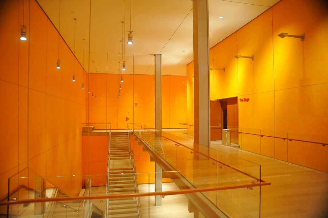Siguen unas fotos de la fotógrafa venezolana residente en Nueva York Patricia Burmicky. La primera es un collage en el cual se puede apreciar en el centro, arriba, la vista hacia la calle, filtrada por tubulares, del edificio de MIT de Fumihiko Maki.