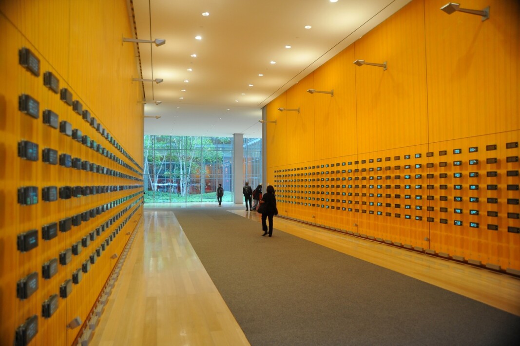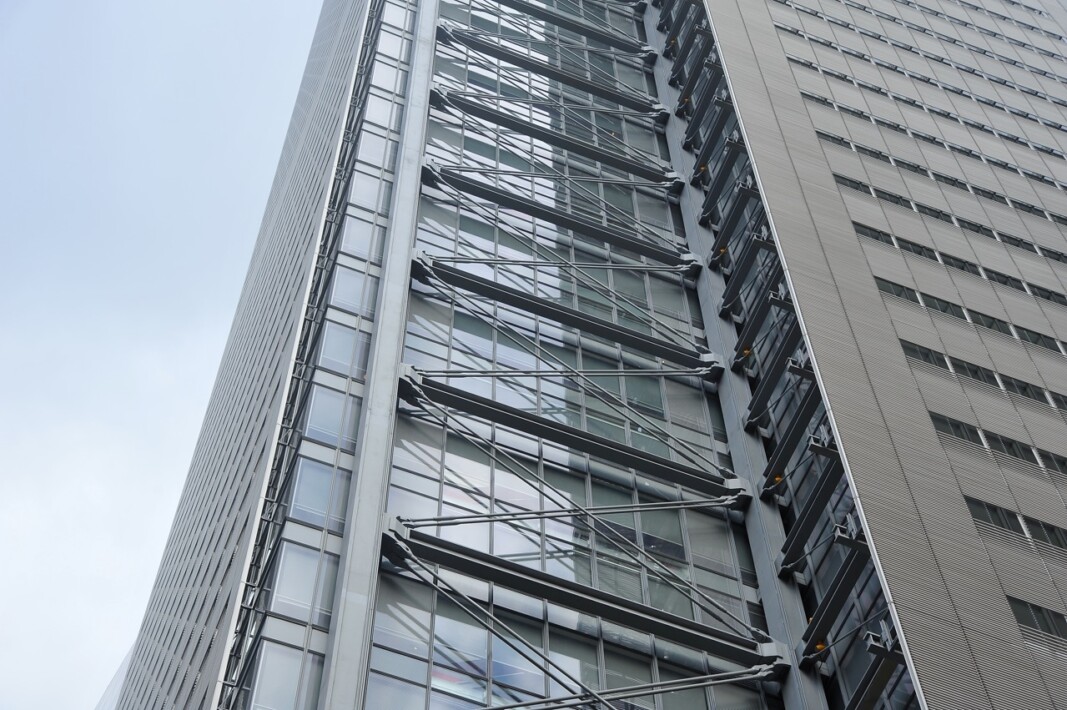El volumen prismático está rodeado por una piel de tubulares de aluminio (o acero inoxidable) que protege el muro cortina que envuelve las oficinas. Hace poco comenté aquí que un edificio del japonés Fumihiko Maki (1928) en el campus de MIT en Boston recurre a un principio muy similar, que se hace hoy técnicamente accesible y es el resultado de la búsqueda de principios de control de la incidencia solar más sutiles que el ya un poco mal visto «quiebrasol» corbusiano y por supuesto que el horripilante cristal entintado de color que somete los usuarios a un permanente ambiente de discoteca. Pero aquí, a diferencia de lo que hace Maki, la piel se interrumpe en bandas horizontales coincidentes con las ventanas de cada piso. Y surge la pregunta sobre el por qué de esta decisión, ya que como se demuestra claramente en Boston (ver foto superior central en el «collage» fotográfico), la percepción del paisaje «filtrado» por los tubos es perfecta, menos el resplandor solar. Si ya se había adoptado el principio protector ¿por qué no hacerlo en todo el volumen? El tamizar permanentemente la vista hubiera planteado un precedente pionero siempre riesgoso, pero no tengo dudas del interés del resultado, y quedaría siempre la opción de crear puntos abiertos en sitios escogidos. Uno siente la sensación de oportunidad perdida si nos imaginamos el enorme volumen, filtrando y reflejando la luz, sin la presencia molesta de los elementos verticales de soporte de la «piel», bien notorios en la realidad.