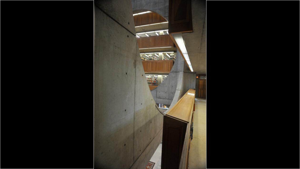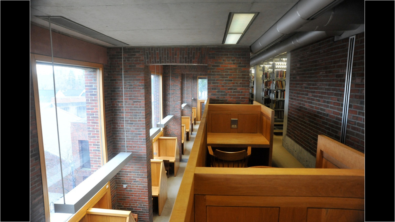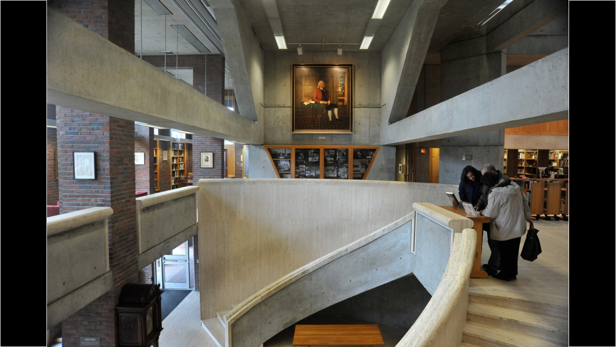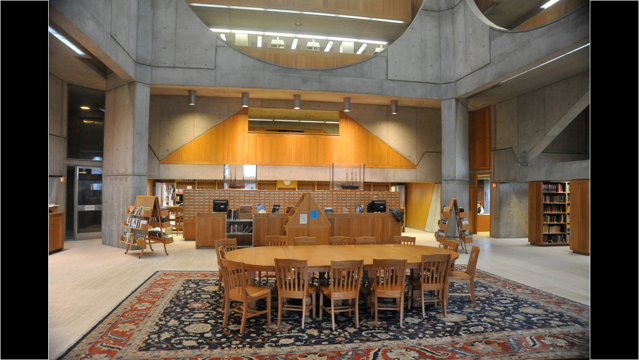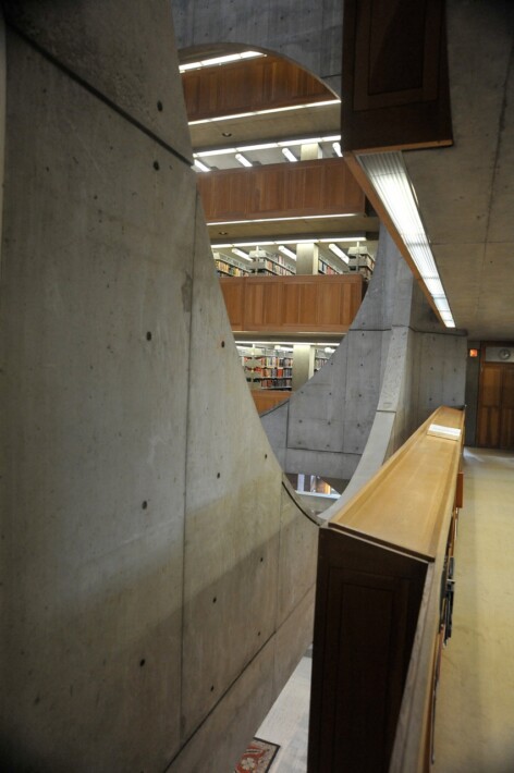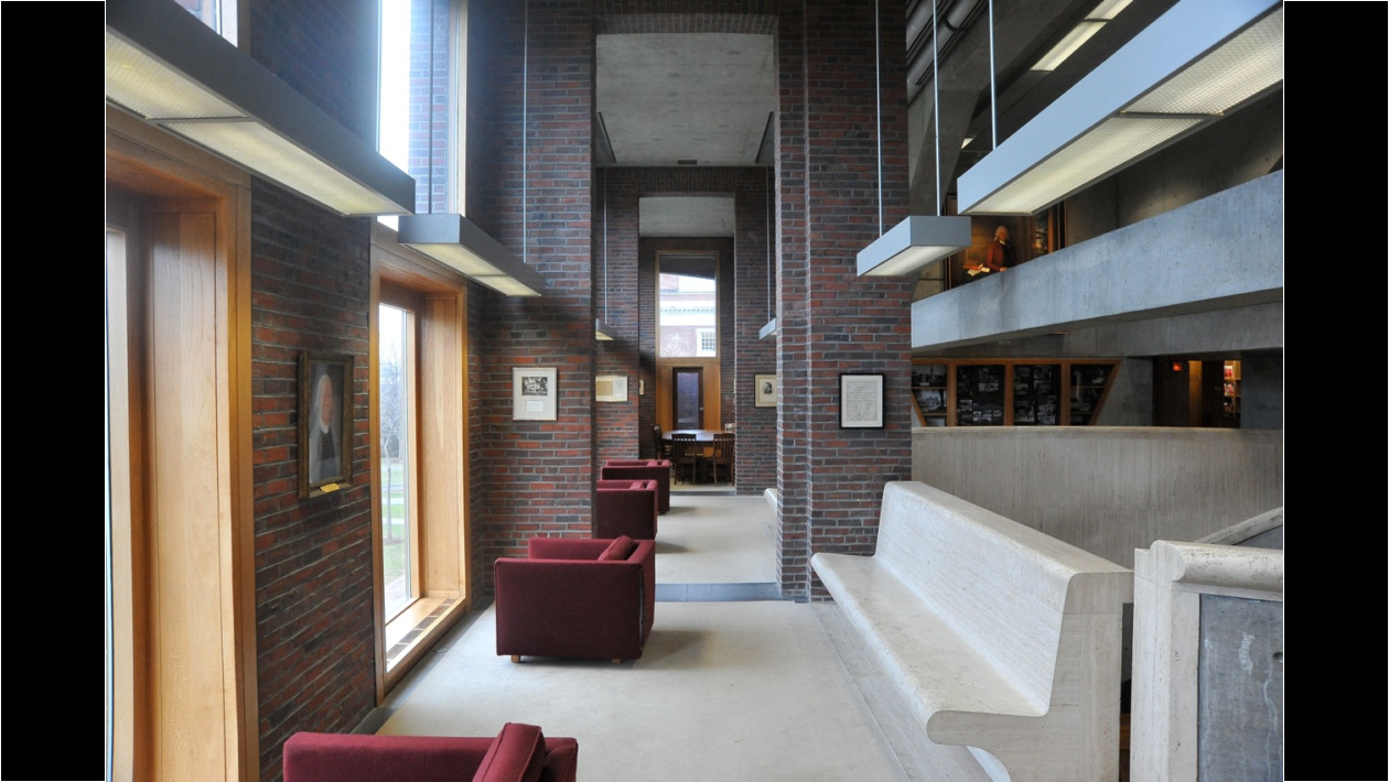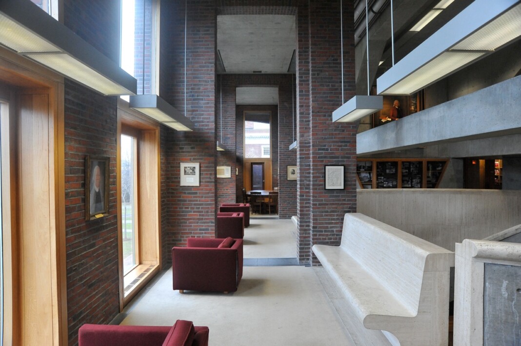 Desde fuera el edificio muestra un respeto especial al contexto (un campus típico del Este de los Estados Unidos, con sobrios edificios de ladrillo), situándose en él moderadamente, mientras que su interior está dominado por el gesto formal, por el impulso de dar un toque glamoroso al atrio interno con luz cenital hacia cual se orientan las estanterías. El resultado es un edificio de dos caras, una interna en la que reinan cuatro enormes círculos decorativos dibujados en el espacio por las vigas de concreto de una estructura difícil de justificar, pesada e ineficaz. Y otra externa rigurosamente ortogonal construida en ladrillo superpuesto al esqueleto de concreto. Ese contrapunto termina siendo el mayor interés del edificio: el espacio interno exultante y sorpresivo, que «engancha» al visitante, versus un exterior escueto y medido. Y pese al disfrute impulsado por la hermosura del atrio, subrayada por la nobleza y austeridad de los materiales dominantes, el edificio deja la impresión de que se cedió a la tentación de «expresarse» forzando decisiones de diseño. Algo que no ocurre en lo mejor de la obra de Kahn.