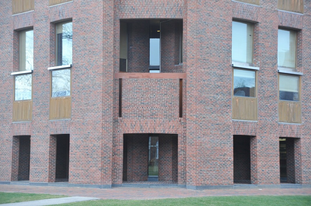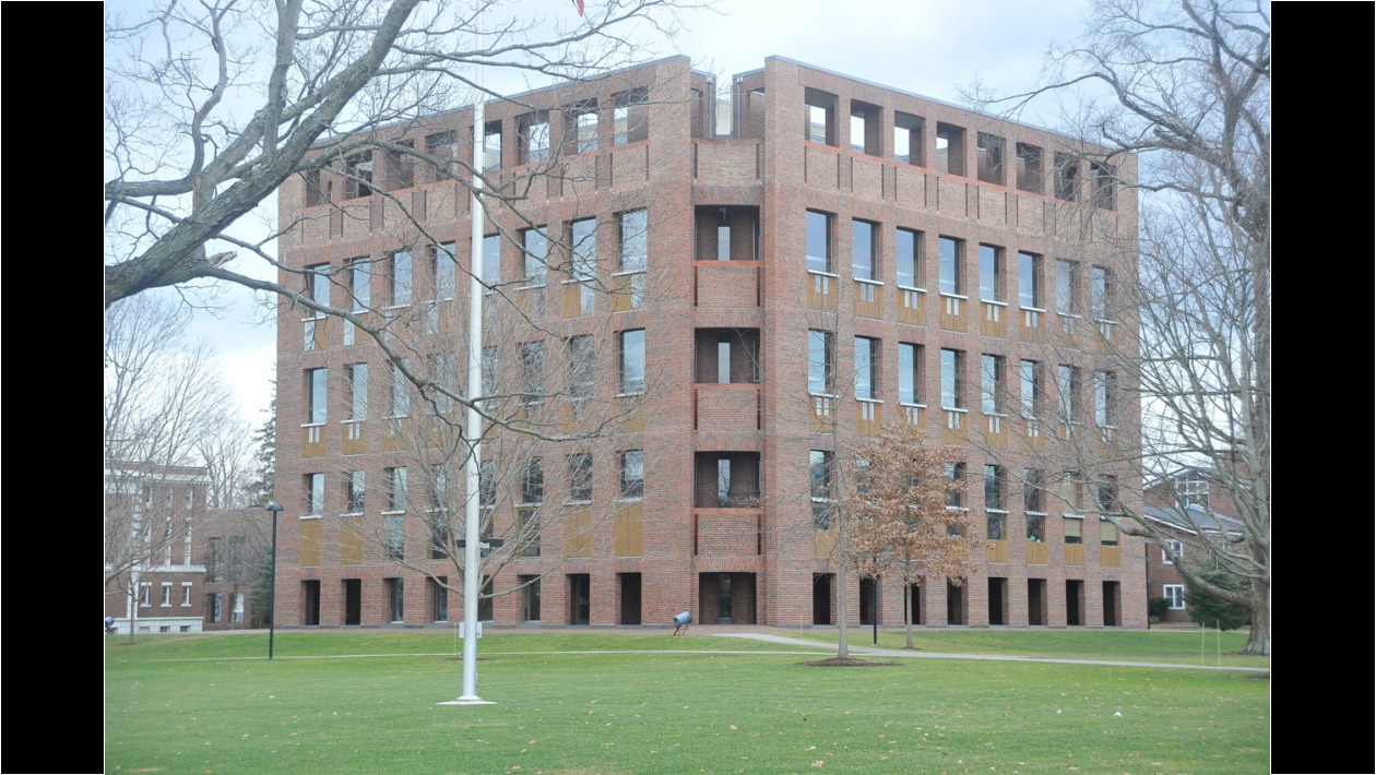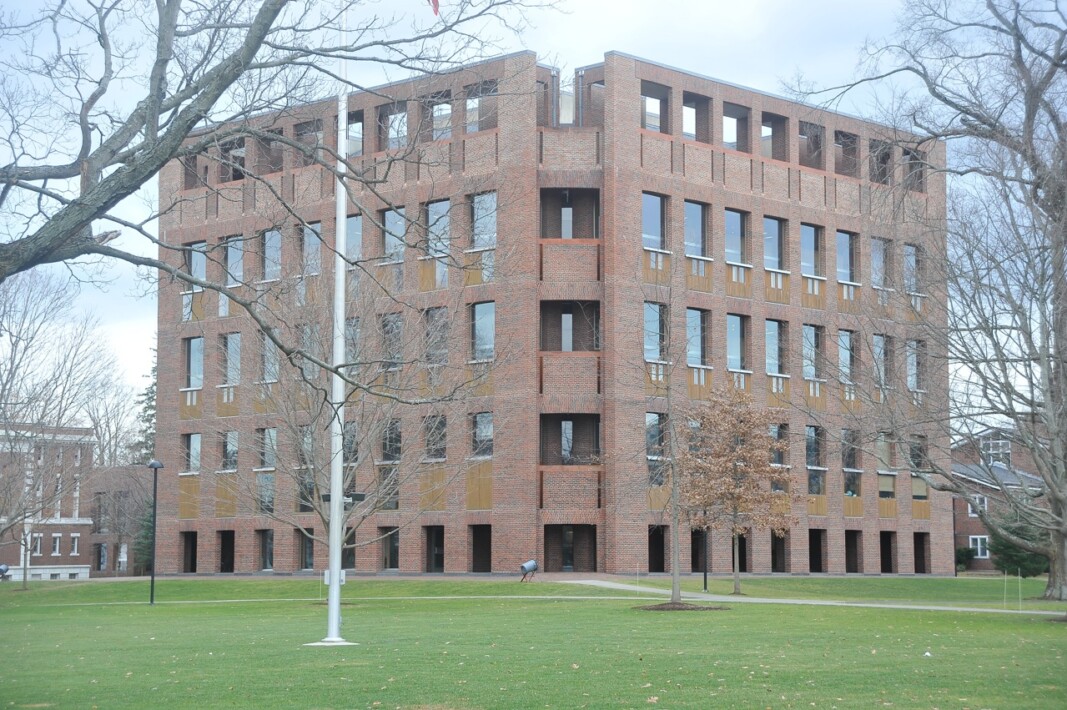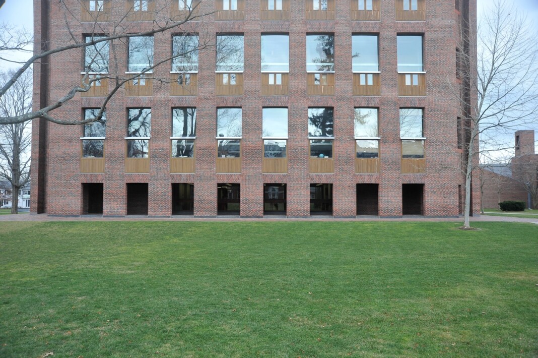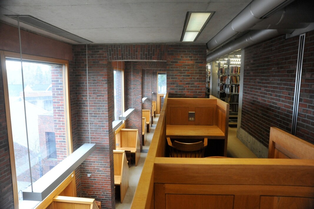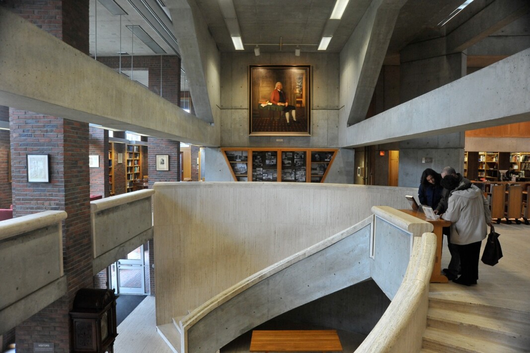 Desde fuera el edificio muestra un respeto especial al contexto (un campus típico del Este de los Estados Unidos, con sobrios edificios de ladrillo), situándose en él moderadamente, mientras que su interior está dominado por el gesto formal, por el impulso de dar un toque glamoroso al atrio interno con luz cenital hacia cual se orientan las estanterías. El resultado es un edificio de dos caras, una interna en la que reinan cuatro enormes círculos decorativos dibujados en el espacio por las vigas de concreto de una estructura difícil de justificar, pesada e ineficaz. Y otra externa rigurosamente ortogonal construida en ladrillo superpuesto al esqueleto de concreto. Ese contrapunto termina siendo el mayor interés del edificio: el espacio interno exultante y sorpresivo, que «engancha» al visitante, versus un exterior escueto y medido. Y pese al disfrute impulsado por la hermosura del atrio, subrayada por la nobleza y austeridad de los materiales dominantes, el edificio deja la impresión de que se cedió a la tentación de «expresarse» forzando decisiones de diseño. Algo que no ocurre en lo mejor de la obra de Kahn.