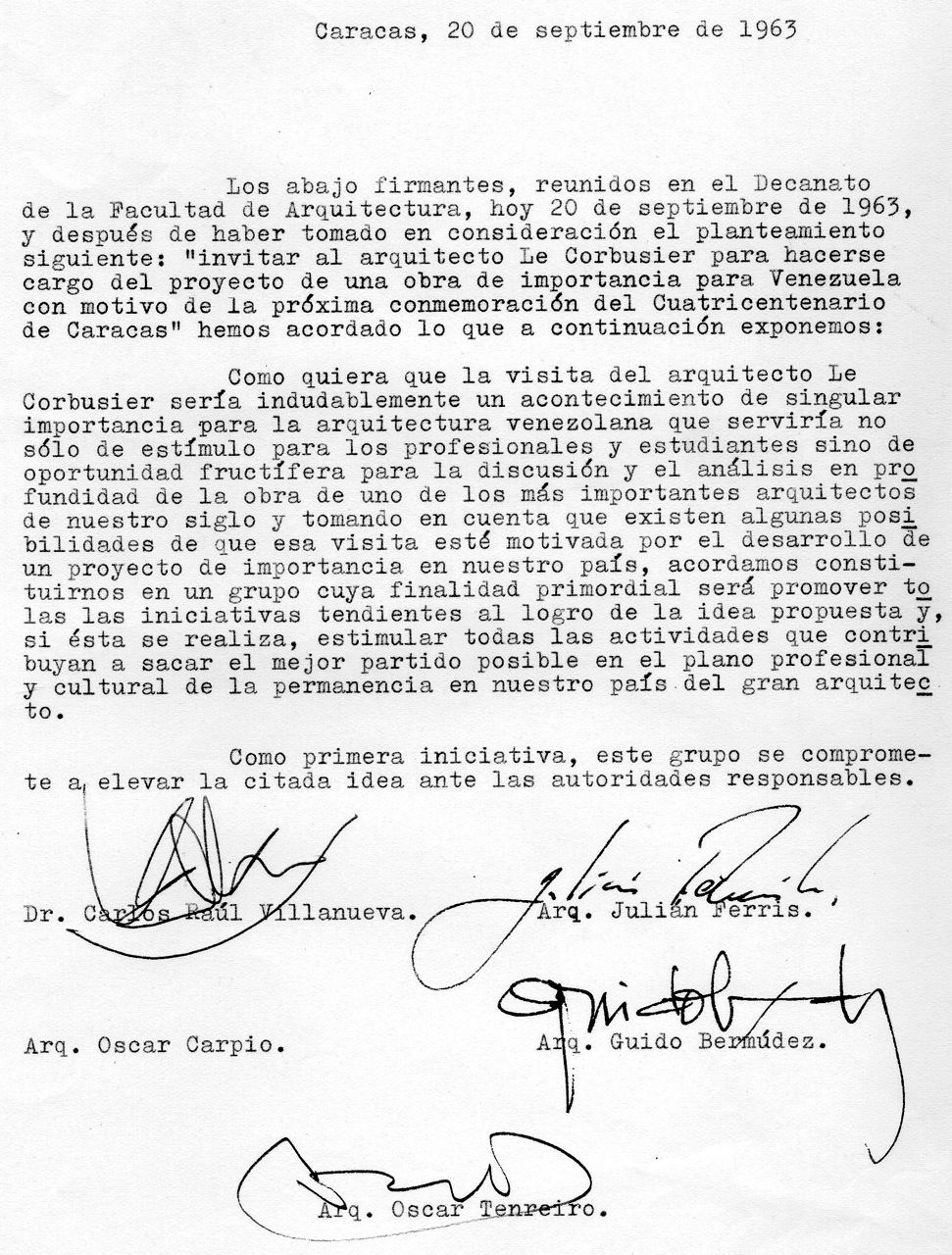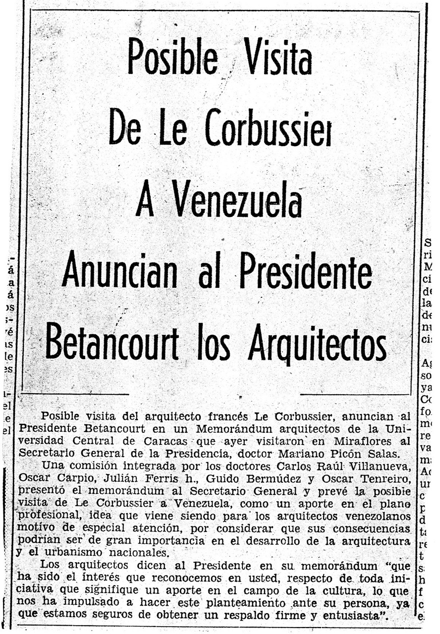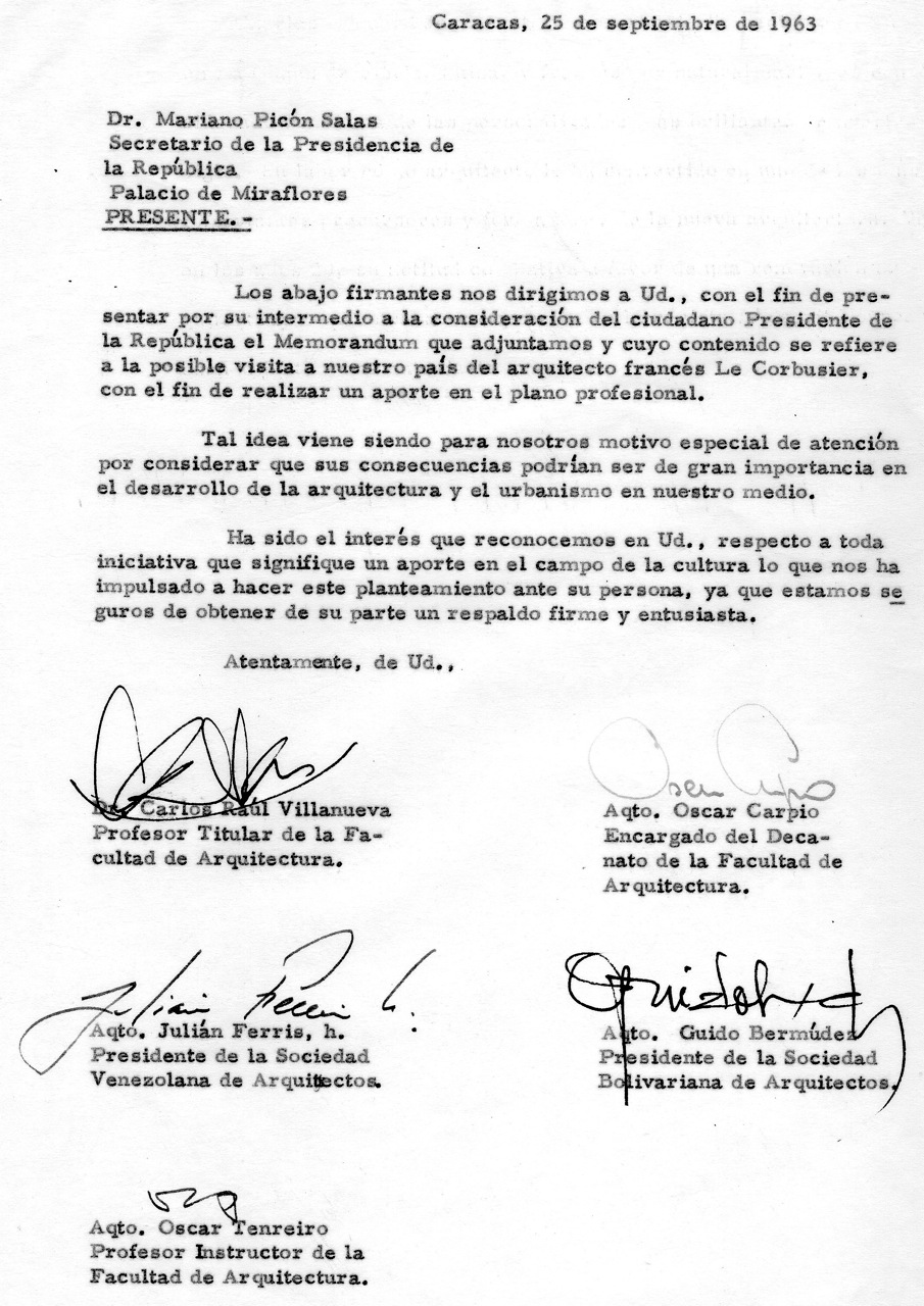 Era obvio que Villanueva tenía que ser figura principal del grupo, no sólo porque su obra tenía raíces firmes en el legado de Corbu, sino porque sus conexiones personales con él garantizaban su adhesión. Lo hizo sin reserva alguna y de allí en adelante asumió una actitud clave en todo el proceso. Los demás fueron: Oscar Carpio, Decano encargado de nuestra Facultad; Julián Ferris, Presidente de la Sociedad Venezolana de Arquitectos y ex-Decano; Guido Bermúdez Briceño, Presidente de la Sociedad Bolivariana de Arquitectos; y Antonio Cruz Fernández Director de la Oficina Municipal de Planeamiento Urbano del Distrito Federal. Con todos hablé y en una primera reunión redactamos una carta dirigida a Picón Salas para pedir formalmente su intermediación, la cual culminó en su sugerencia de orientar todo a través de Alejandro Oropeza Castillo, Gobernador del Distrito Federal, mientras él se comprometía a apoyar la idea desde su elevada posición.