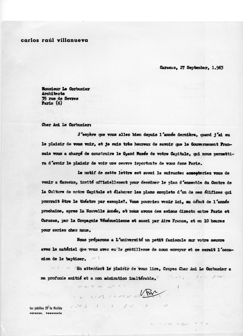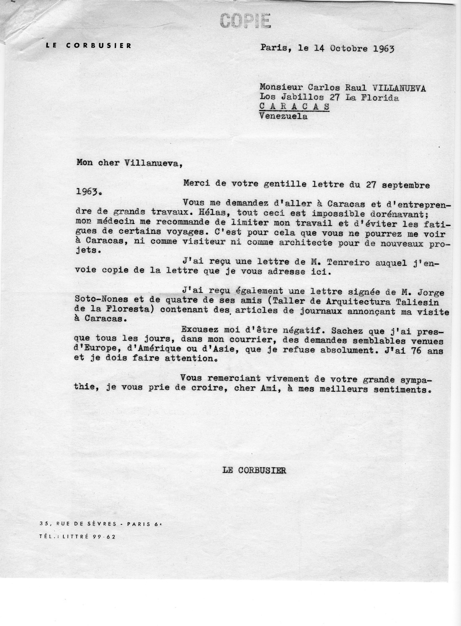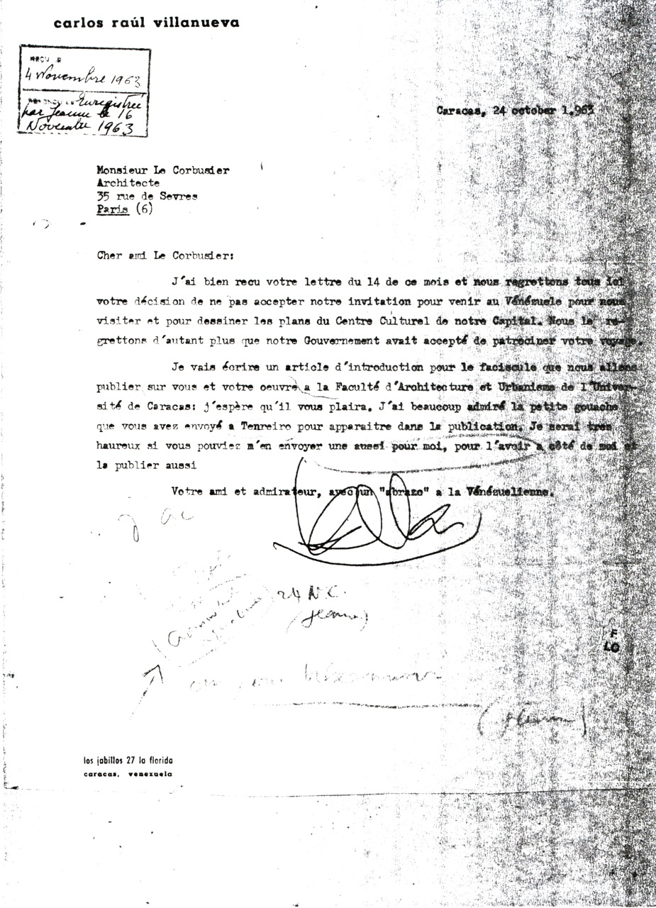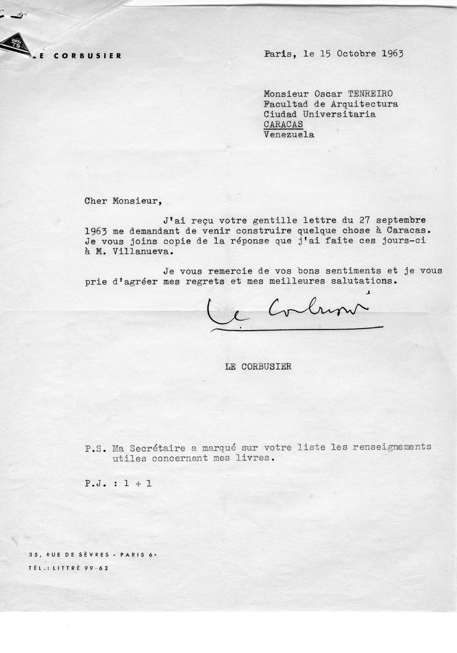 En esa reunión se acordó que Villanueva le escribiera de inmediato a Corbusier para consultarle la posibilidad de aceptación a la invitación. Él lo aceptó de muy buen grado y así lo hizo en carta fechada el 27 de Septiembre. Ese mismo día, estimulado por los contactos anteriores, también yo le escribí de modo más informal (a mano y con unas cuantas tachaduras) ampliando el alcance de lo que se le ofrecía y extendiéndome en otras consideraciones sobre el posible impacto de su visita. Y como yo venía siendo de hecho algo así como el secretario ejecutivo del grupo, me pidieron que preparara una semblanza de Le Corbusier que sirviera de fundamento a la audiencia con Oropeza Castillo.