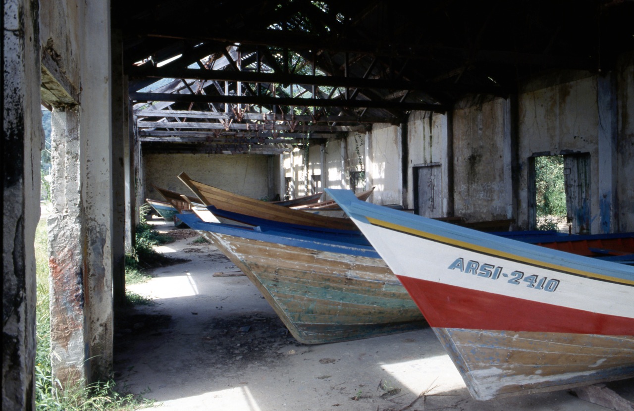 Con Joel, acompañado de su hija Daniela, Isabel Sanchez, Luis Guillermo Marcano, y otros más de nuestro Taller, hicimos una visita a Macuro que terminó en un incidente en el que estuve a punto de perder la vida. Tenía a mi lado a la hija de Joel, Daniela, a quien él había llevado al viaje, cuando una bala salida del arma que un irresponsable quería «probar» mientras conducía la embarcación que nos transportaba, convirtió el paseo a Uquire, que habíamos preparado después de las sesiones de trabajo de Macuro el día anterior, en un difícil incidente que nos llevó buscando auxilio médico hasta Trinidad. Otro día lo narraré con más detalle pero basta decir que Uquire, del lado Norte de la Península de Paria, pasando la Boca del Dragón, hermosísimo lugar que hace pensar en La Tierra de Gracia mencionada por Colón, es un lugar donde dudosos contrabandos destinados a Trinidad (distante una hora en peñero) permiten traficar con armas.