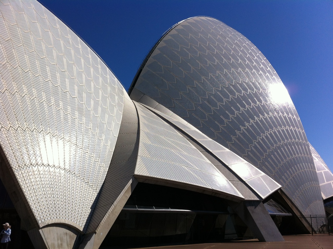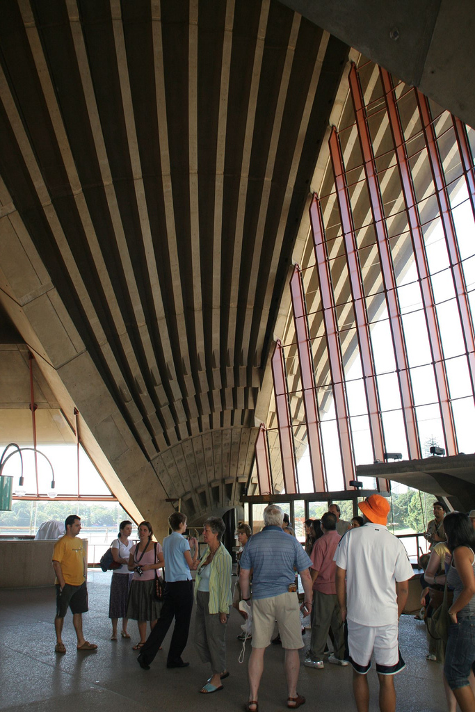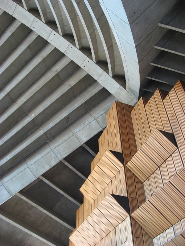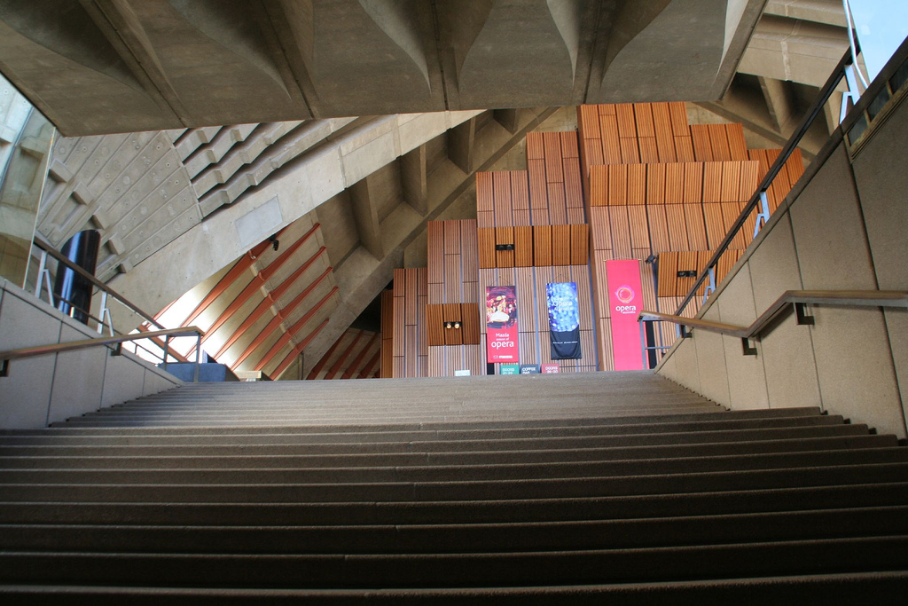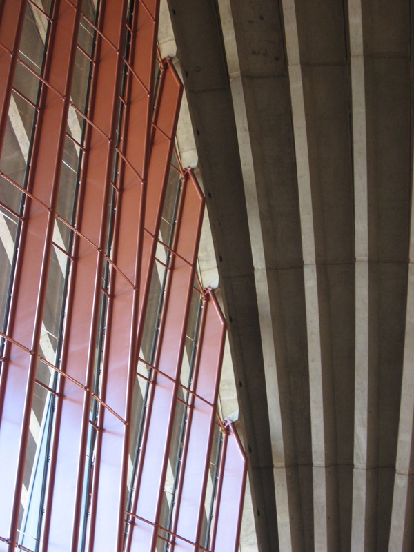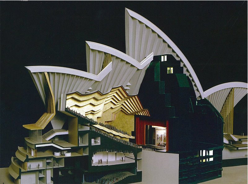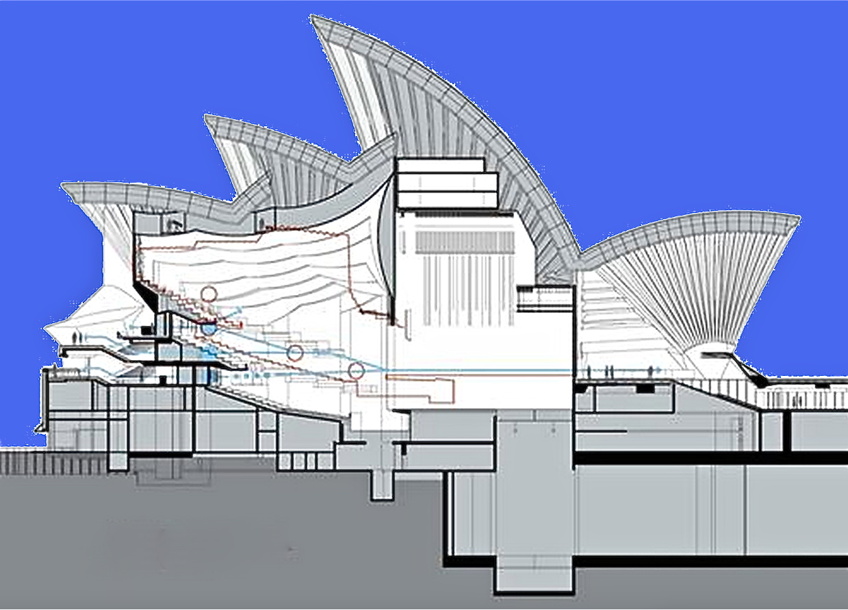 Si a pesar de eso la Ópera se ha convertido en referencia universal es porque ya varias de las decisiones fundamentales de diseño estaban tomadas. El envoltorio que es sin duda la presencia del edificio en el paisaje urbano de Sydney y en particular en la bahía, el fiordo como la llamaba Utzon, no sólo estaba construido sino que las previsiones para el recubrimiento cerámico, uno de sus mayores aciertos, estaban tomadas. También la configuración del podium que le sirve de apoyo y las hermosísimas escalinatas que llevan hasta su nivel superior, todo lo cual en gran medida son el edificio, como siempre ocurre con la gran arquitectura de todos los tiempos. Y para el interior y sus detalles, había muchas pistas y planos de Utzon.
