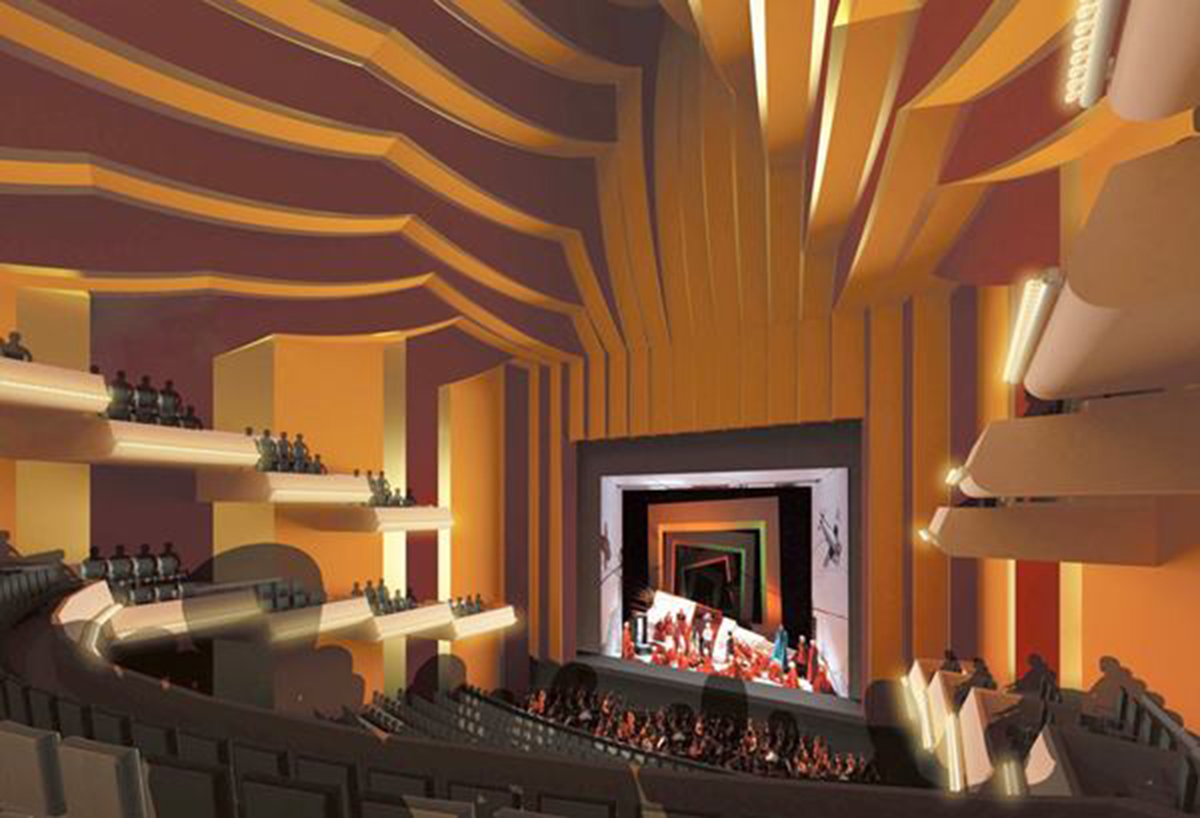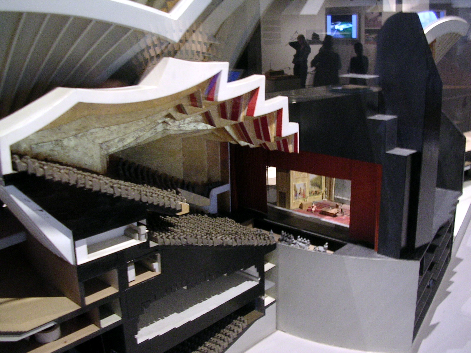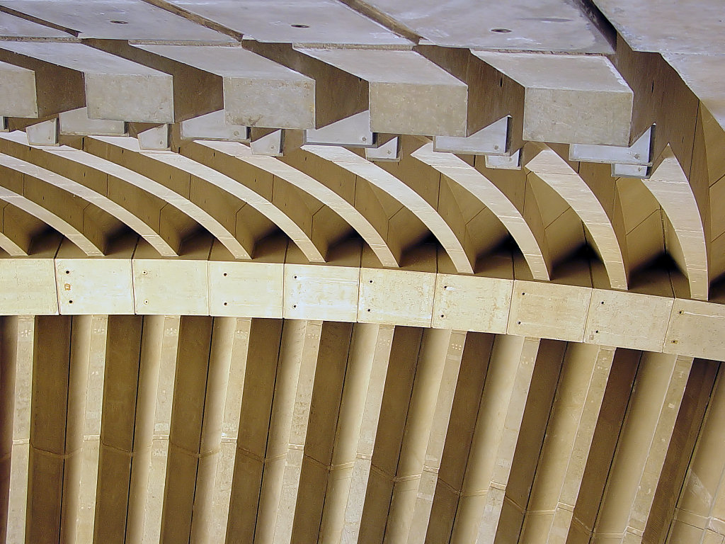 Para ese momento ya habían sido superadas las enormes dificultades técnicas planteadas  por la construcción de las cáscaras (en realidad no son cáscaras sino nervaduras pretensadas y postensadas entre sí) externas, es decir las que envuelven el edificio, la primera de la serie de experiencias actuales, lo hice notar la semana pasada, que usan ese recurso del envoltorio general en la arquitectura teatral.