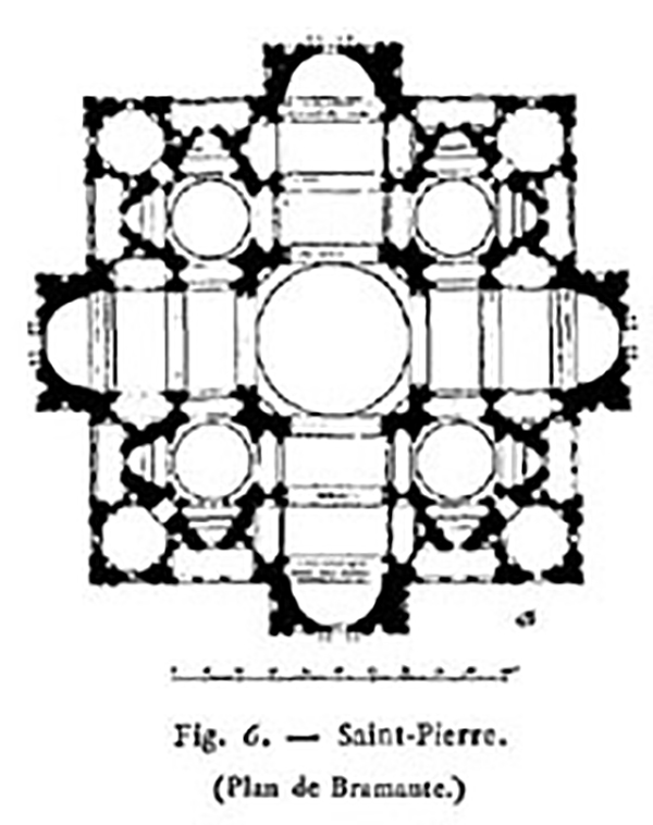 A Miguel Ángel le pareció errónea la decisión tomada por Rafael y Sangallo de modificar el proyecto de Bramante, de planta central en cruz griega con la gran cúpula como centro geométrico, a la de cruz latina alargando el brazo del acceso para crear una nave. Lo puso como condición de su jefatura y además lo razonó por escrito dejando clara su admiración por Bramante, quien había sido su rival años atrás. No se puede negar… escribió en una carta al canónico de San Pedro…que Bramante no fuese excelente entre los que han profesado la arquitectura desde la Antigüedad hasta aquí…el proyecto de Bramante…no está lleno de confusión…sino que era claro y preciso, luminoso y despejado…quienquiera que se desvíe del dicho orden de Bramante como ha hecho Antonio de Sangallo se desvía de la verdad, y que es así lo puede ver cualquiera que observe su modelo con mirada imparcial…”
