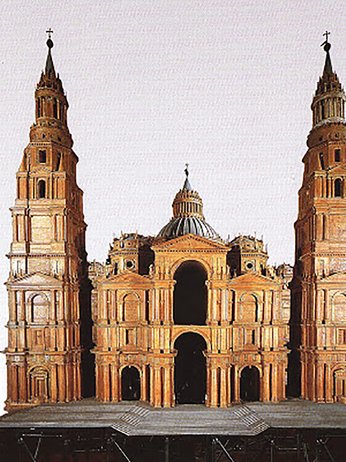 Uno de los aspectos más interesantes de la irrupción de Miguel Ángel en 1547 como arquitecto jefe de las obras de la Basílica de San Pedro gracias a la decisión del Papa Pablo III (1534-1549), fue su rechazo del proyecto previo de Antonio da Sangallo el Joven (1484-1546), rechazo que acarreó considerables inconvenientes pero se llevó adelante con el apoyo papal. Sangallo había sido asistente del primer jefe de obras, Donato Bramante (1444-1514) quien junto a Rafael Sanzio (quien murió en 1520 de apenas 37 años) estuvo por treinta y dos años, desde la muerte de Bramante, a cargo de las obras hasta morir en 1546.