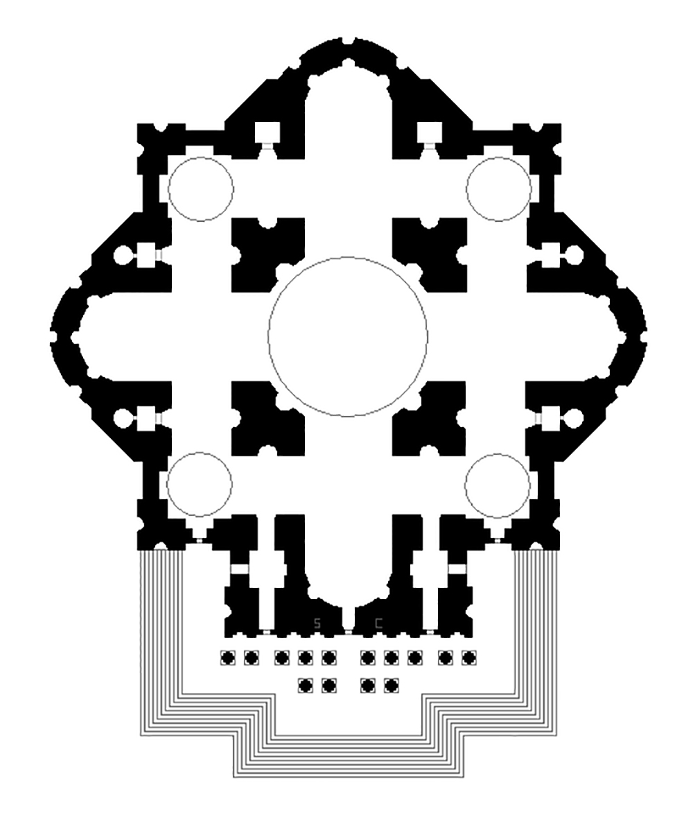 Es este un muy interesante ejemplo, en menores dimensiones, de lo que se proponía Bramante con San Pedro. Es un referente técnico de cómo se contrarresta el empuje de la cúpula central con las semicúpulas del perímetro, de un modo que sigue el prototipo romano de Hagia Sophia en Estambul.