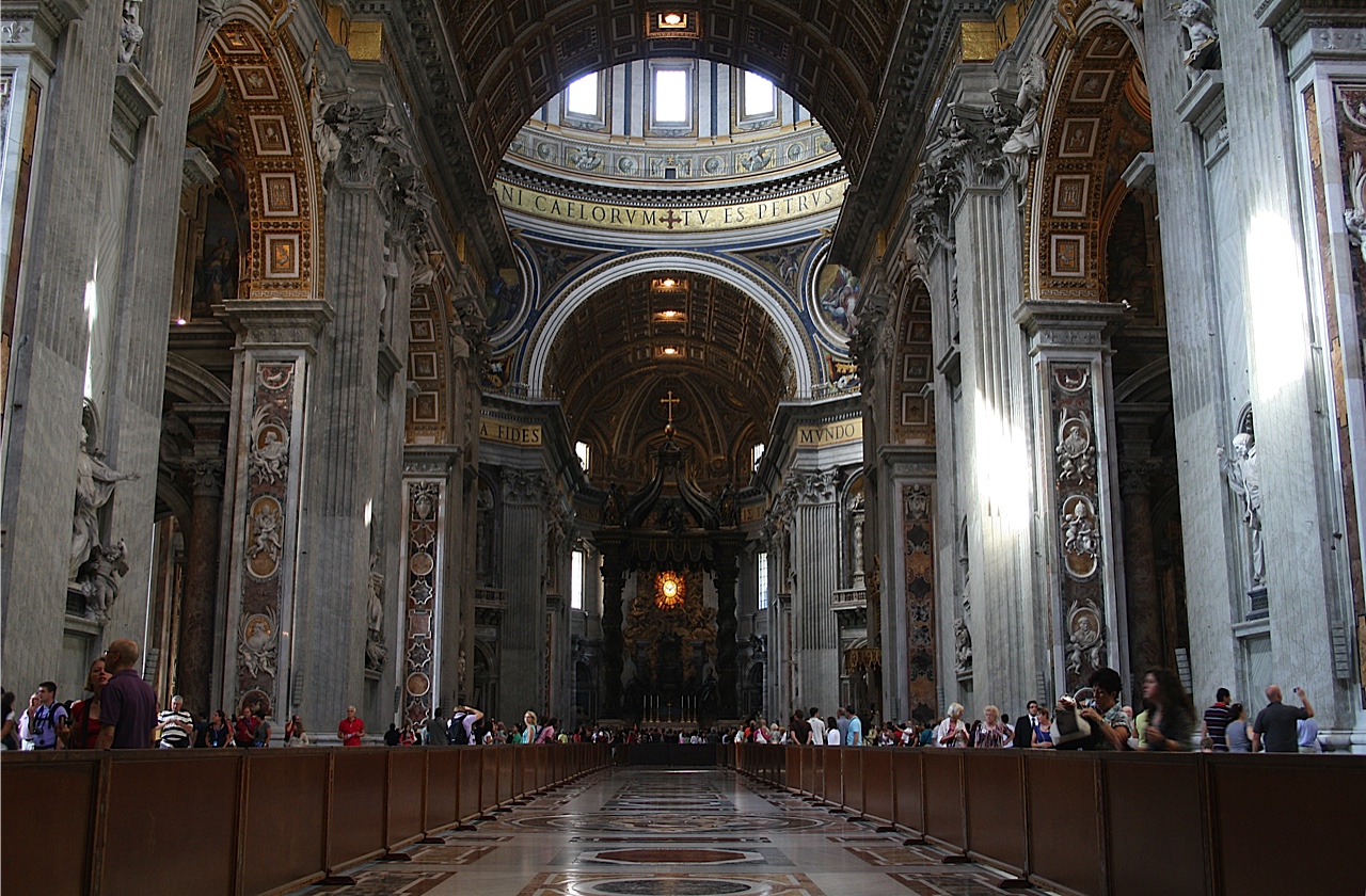 Y en los más de 2000 m2 cubiertos libremente por la cúpula de San Pedro, nos sorprende que reine la luz. Sin el dramatismo gótico, en cuyas catedrales umbrosas se filtra por los vitrales horadando los espacios. Aquí parece la metáfora de la espiritualidad que redescubre al hombre. Y también su orgullo y sus desmesuras, muchas de ellas reveladas en este sorprendente monumento.