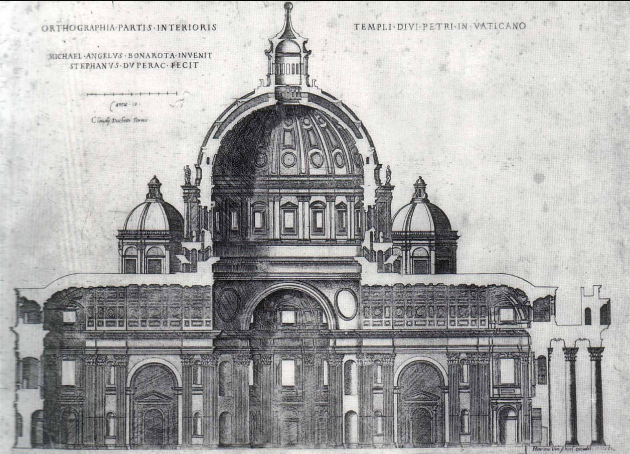 Uno de los aspectos más interesantes de la irrupción de Miguel Ángel en 1547 como arquitecto jefe de las obras de la Basílica de San Pedro gracias a la decisión del Papa Pablo III (1534-1549), fue su rechazo del proyecto previo de Antonio da Sangallo el Joven (1484-1546), rechazo que acarreó considerables inconvenientes pero se llevó adelante con el apoyo papal. Sangallo había sido asistente del primer jefe de obras, Donato Bramante (1444-1514) quien junto a Rafael Sanzio (quien murió en 1520 de apenas 37 años) estuvo por treinta y dos años, desde la muerte de Bramante, a cargo de las obras hasta morir en 1546.