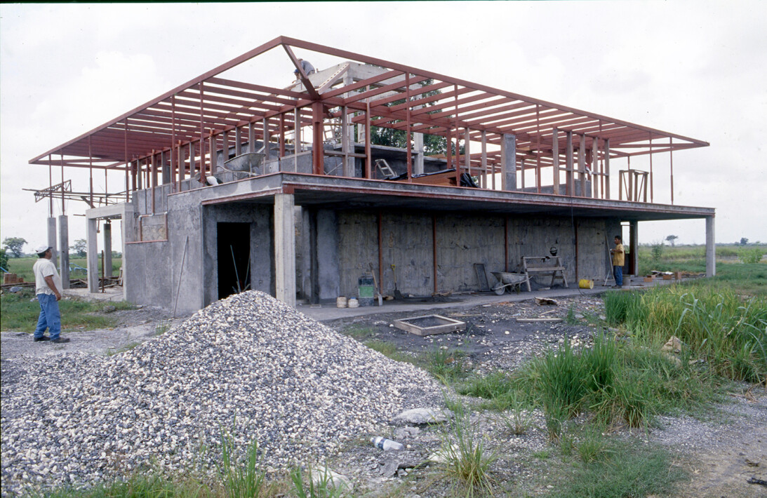 Dar con las fotografías y digitalizarlas sumándolas a las que ya tenía me llevó a recordarme de las incidencias de aquella experiencia docente que permitió a una estudiante como Carolina vivir los distintos momentos, con frecuencia problemáticos, que acompañan a la transformación del proyecto en realidad construida. En esa etapa de realización –el proyecto tomó un semestre completo, la construcción casi dos– mi presencia en el proceso se hizo más decisiva sin que por ello Carolina haya bajado en ningún momento la intensidad de su compromiso, todo lo cual se expresó en el resultado, que todavía hoy, después de más de veinte años transcurridos, me emociona y me impulsa a documentarlo. Es una propuesta de arquitectura sólida, atractiva y sobre todo conectada, me parece, de modo claro, con una geografía y un clima: es expresión de arquitectura nacida de un medio natural. Fue para mí un trabajo en colaboración en el cual el diálogo entre mi persona como profesor y el aporte del estudiante, fue conduciendo a una síntesis en la cual se suman intenciones que lograron ser expresadas en el resultado final. Y disfruto hoy al recorrer las imágenes de hace dos décadas. Disfrute que asocio a valores de la arquitectura que han sido claves para mí (los principios estructurales, los materiales, los tipos arquitectónicos heredados, cortar el sol tropical con la sombra de los aleros y sus prolongaciones, el color pintado o embebido mediante pigmentos minerales en el revoque) que esta joven contando con el apoyo de su madre y la muy bienvenida soltura procedimental de nuestra Facultad de Arquitectura –su mejor atributo, sin duda– logró edificar en las planicies de nuestro país.
